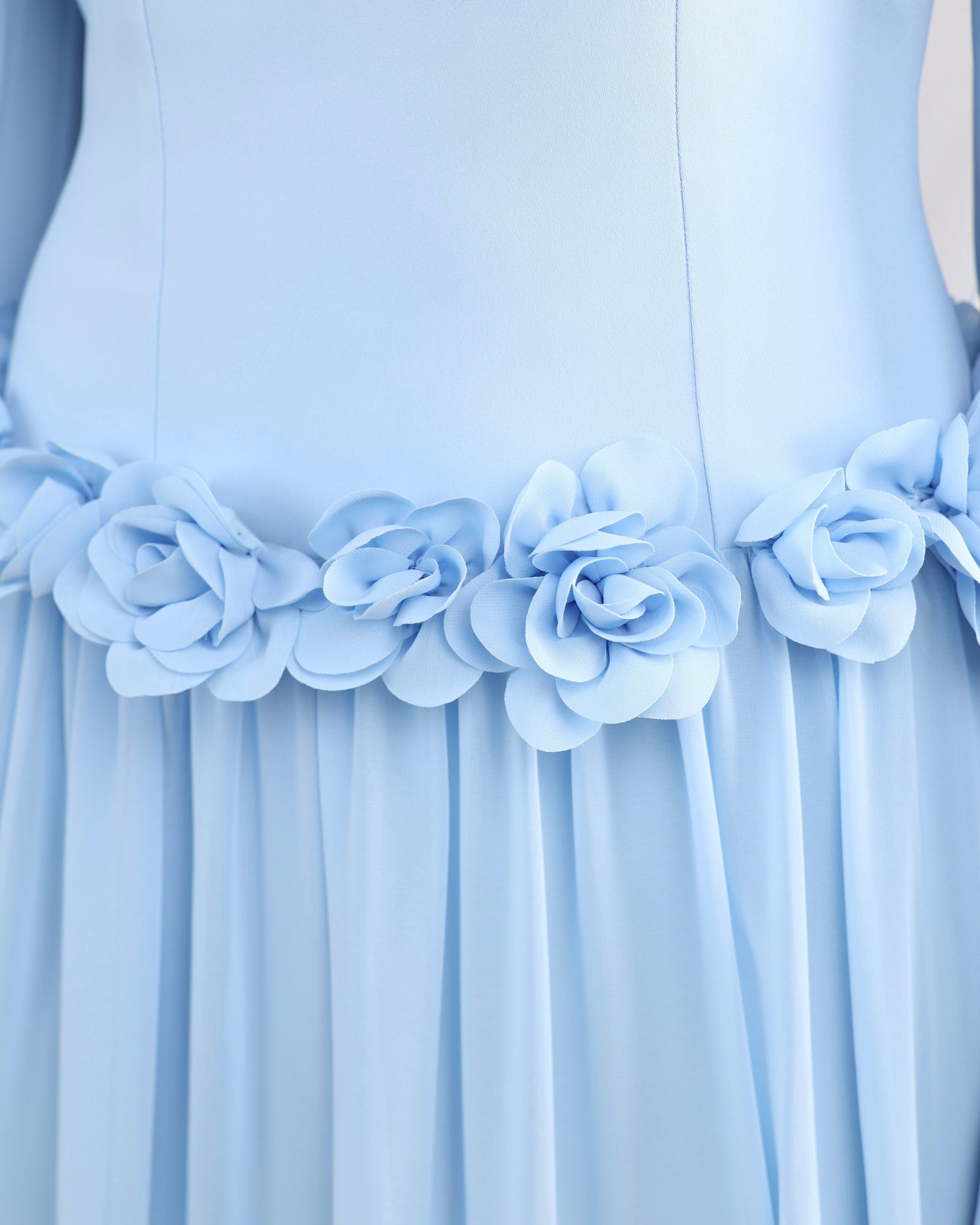 A lowered waistline is traced with hand-crafted 3D florals, adding depth and texture while subtly defining the silhouette. The contrast of the two fabrics creates a gentle transition from tailored form to flowing drape, giving the gown its light, romantic presence for special occasions.