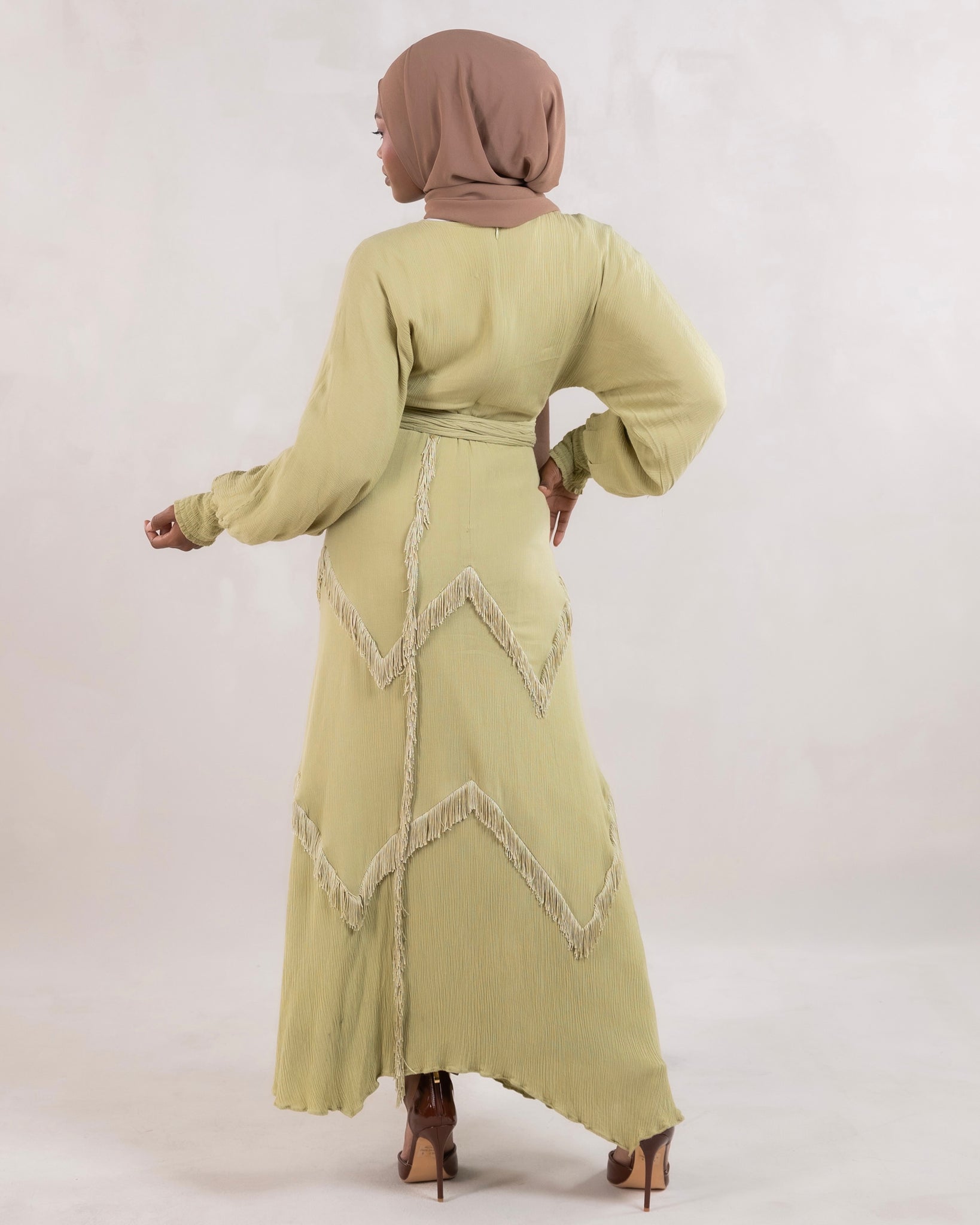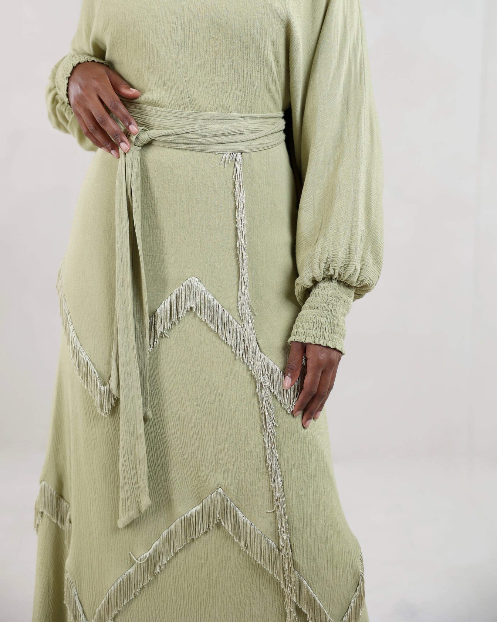 Introducing "Atheena" – a summer sensation. This cotton dress is both breathable and lightweight, perfect for hot days. Featuring unique fringe details and an asymmetrical hem. Double lined. Removable belt.