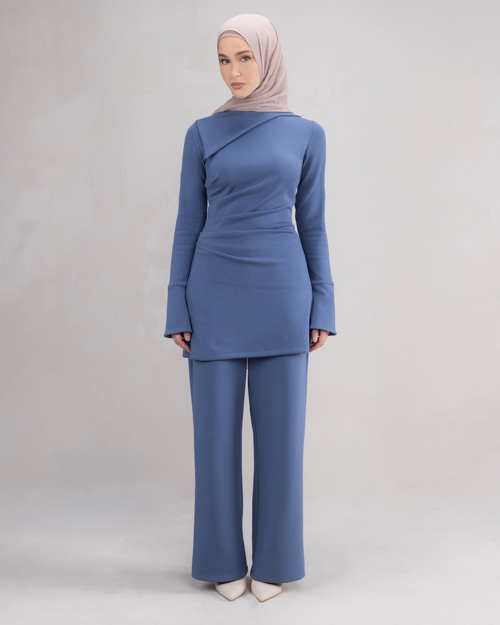 The top features a soft pleated waist detail that shapes beautifully, paired with a gentle flap that drapes over the shoulder and back for a subtle, feminine touch. The matching pants are designed with an elastic waistband and a smooth, flattering fall—comfortable enough for long days yet polished enough to elevate your look instantly.