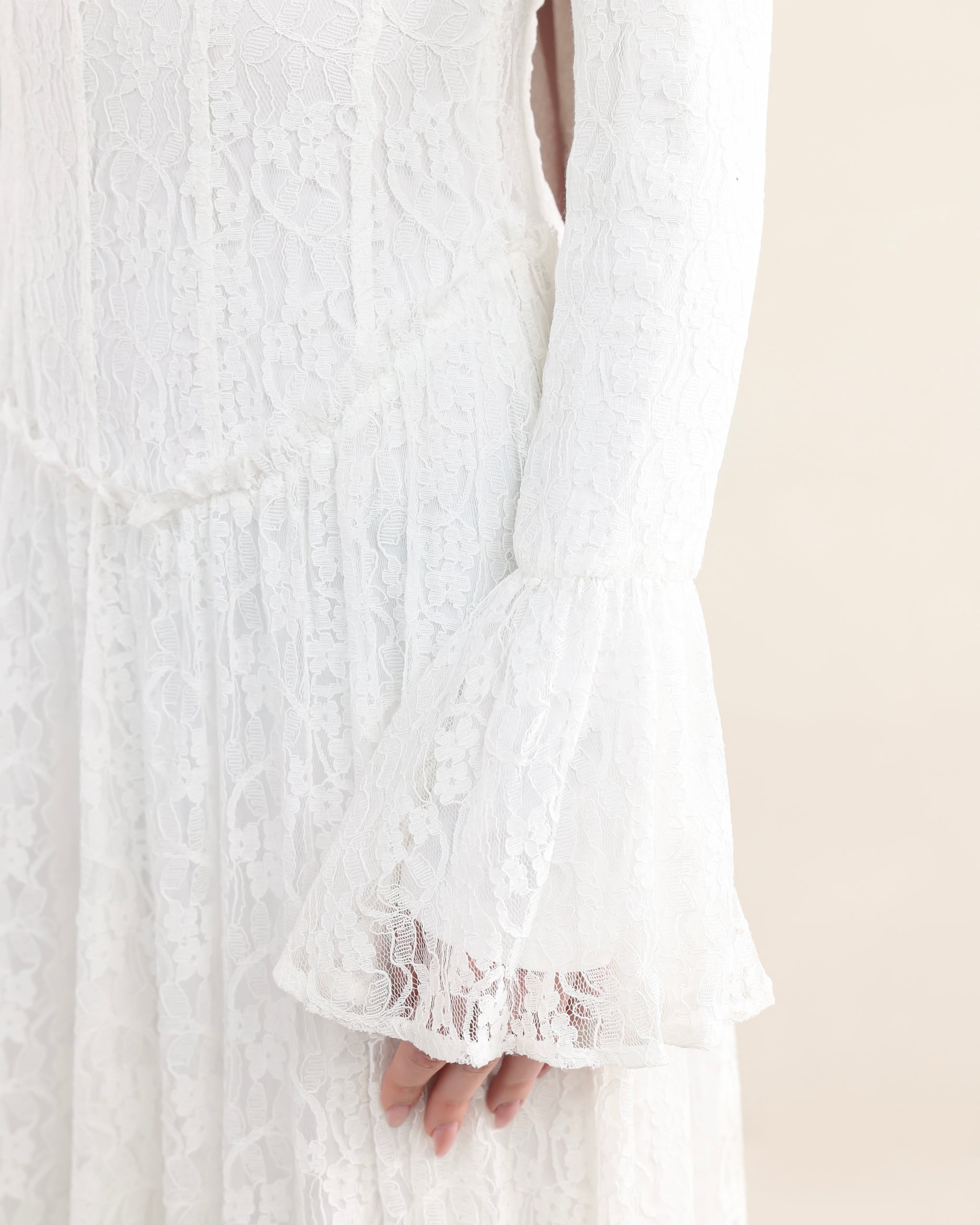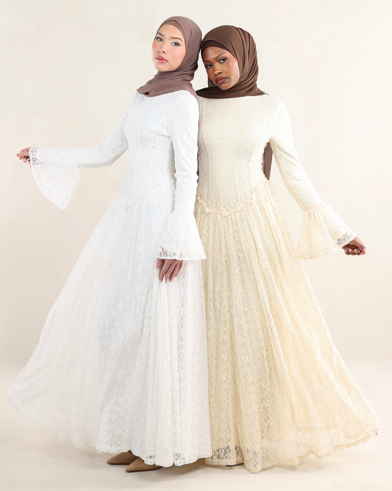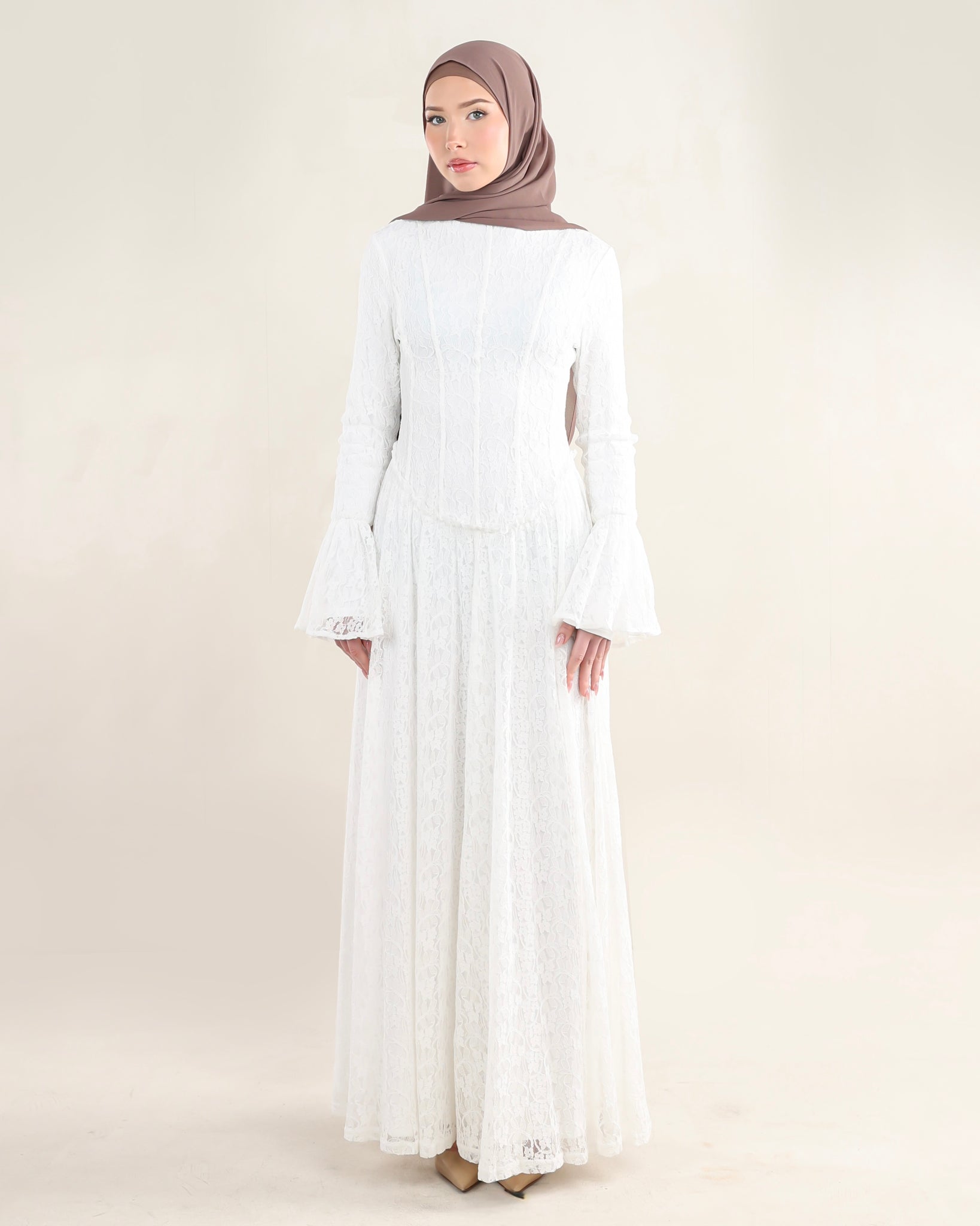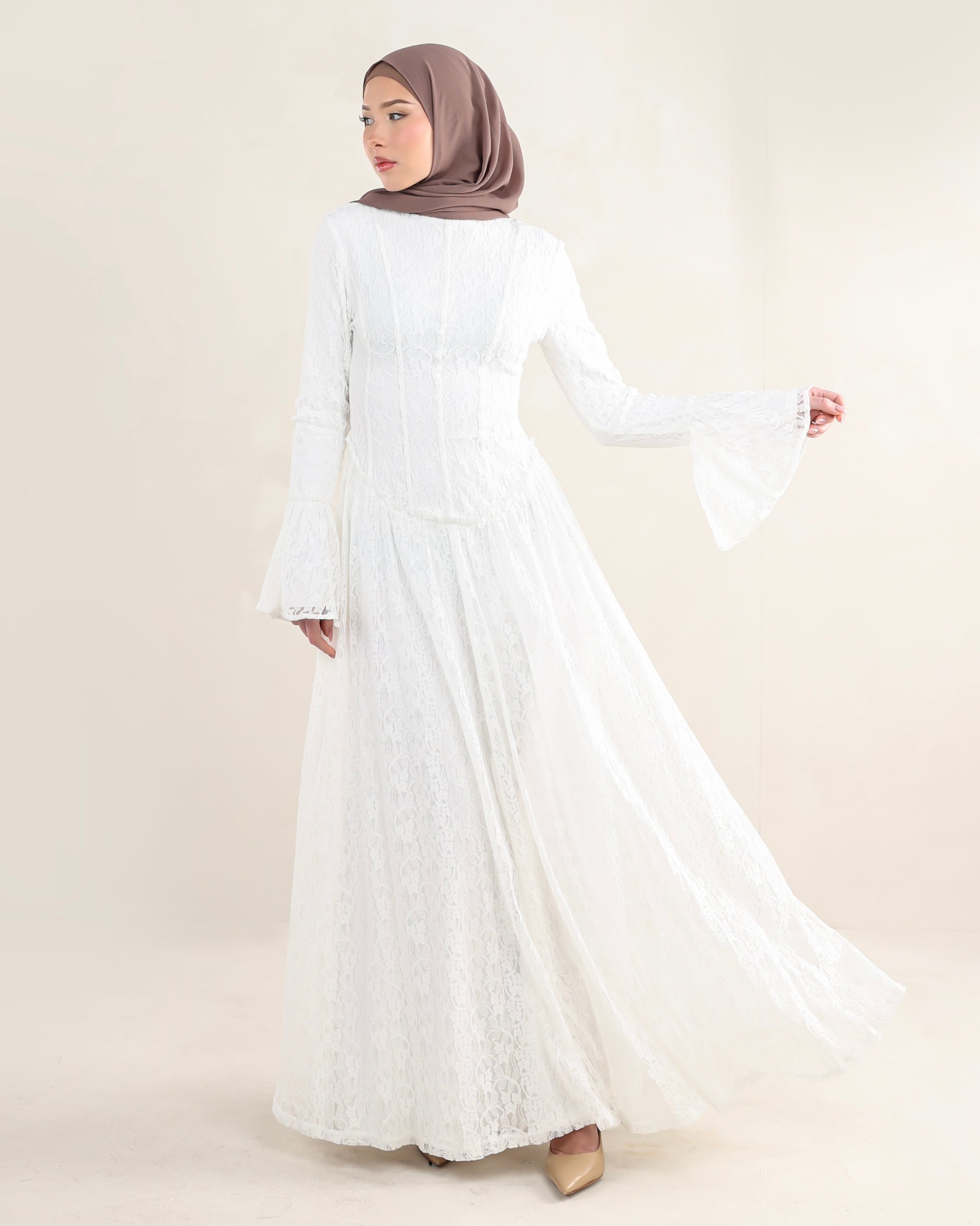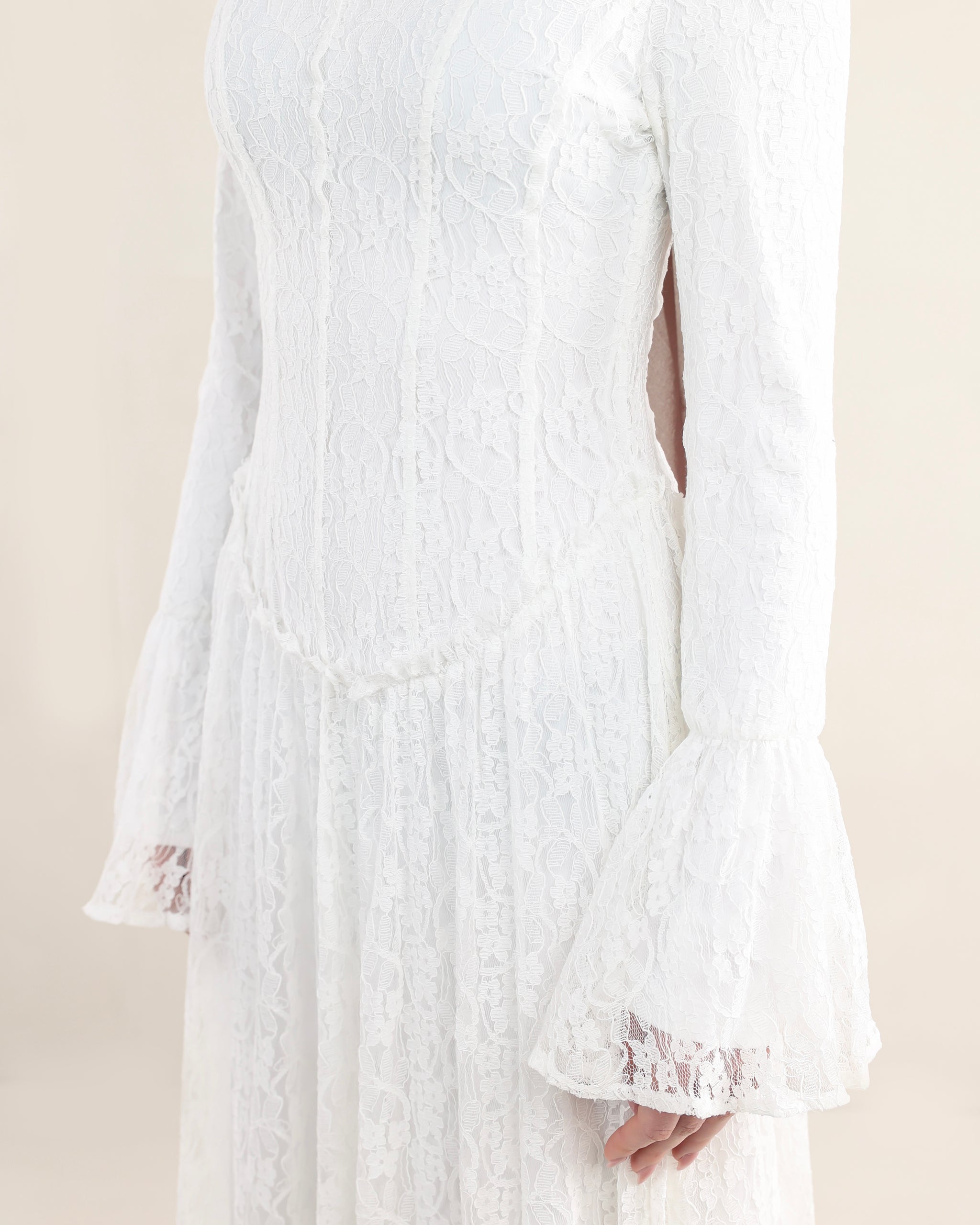 Introducing Bayan. A lace dress designed with soft structure and graceful detail. The gently scooped low-to-mid rise waist shapes the silhouette with ease, while flared cuffs add a delicate sense of movement. Vertical paneling creates a refined, elongated line throughout the dress. Fully lined for comfort and coverage, Bayan feels feminine, considered, and timeless — a piece meant to be worn and loved season after season.