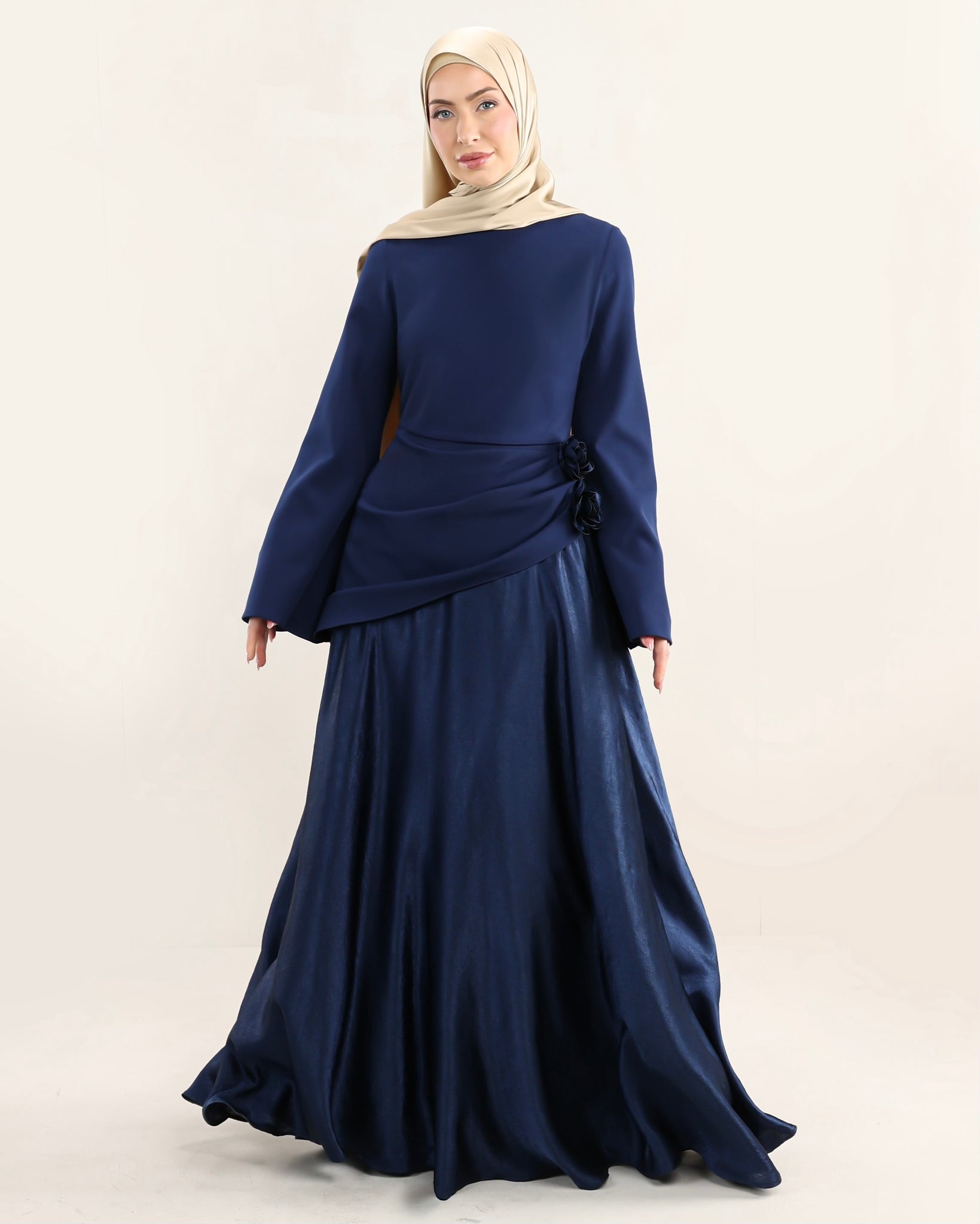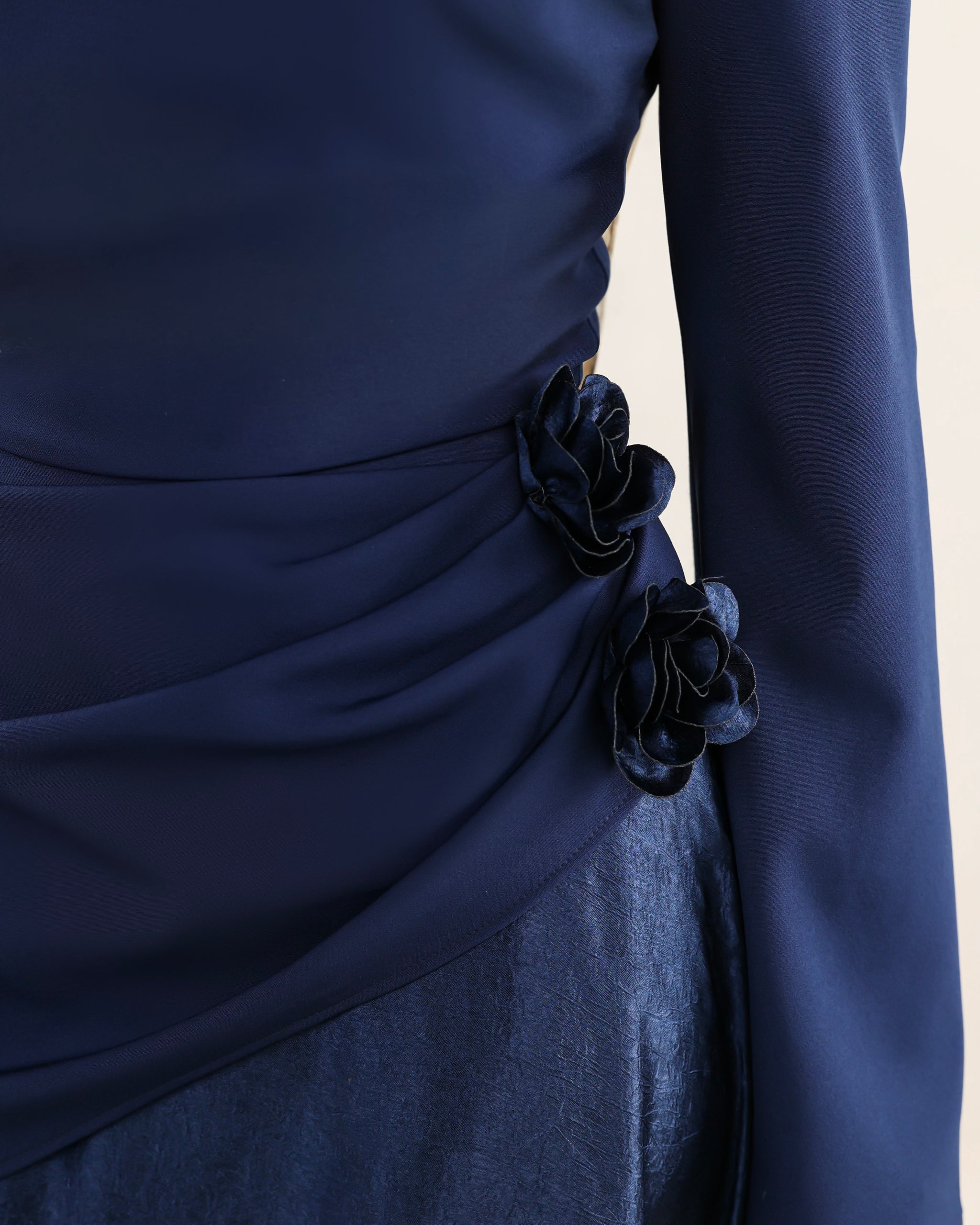 Handcrafted flowers, made from the same crushed satin, are delicately placed to connect the two sections and create a cohesive finish. A statement piece created for your most special moments.