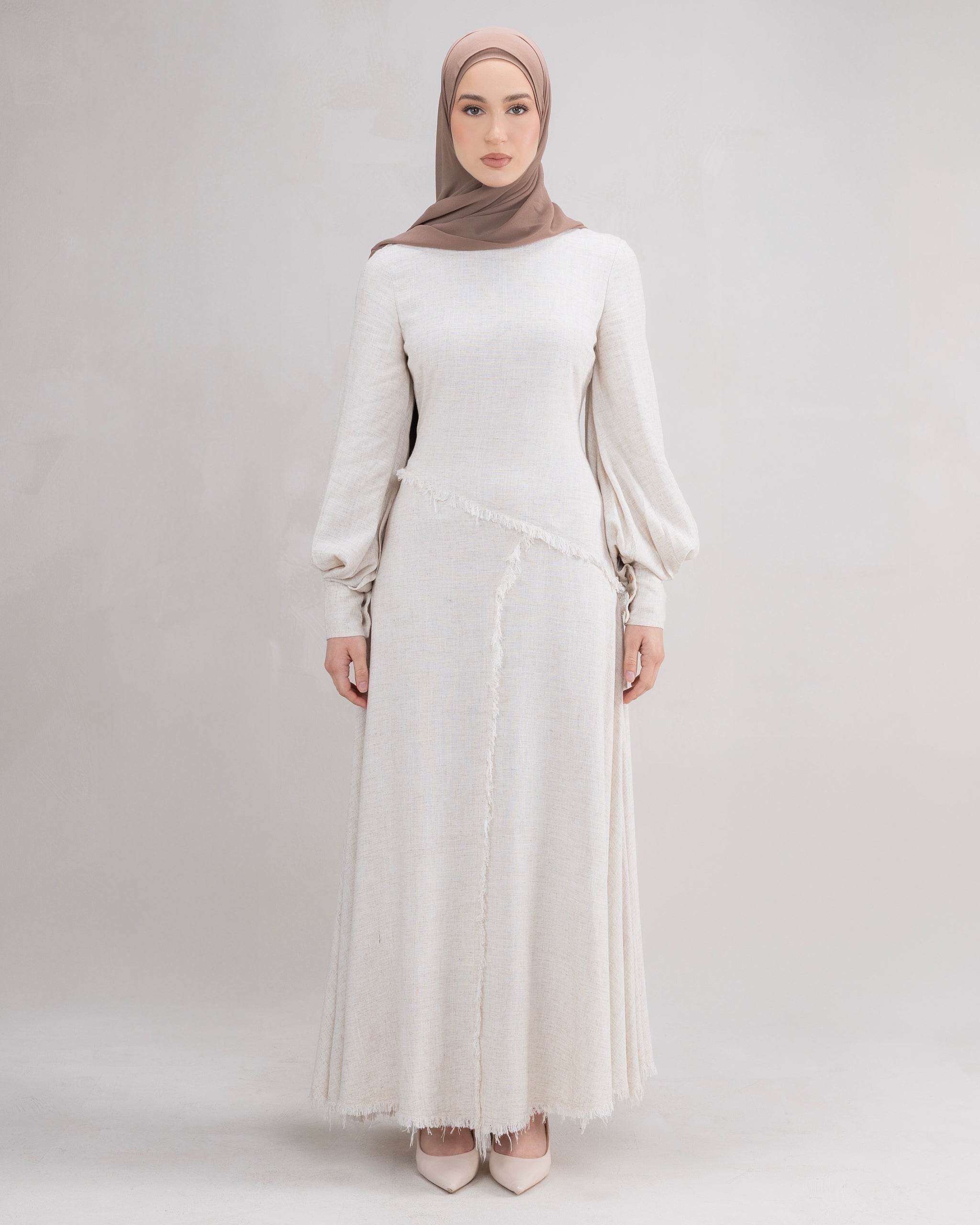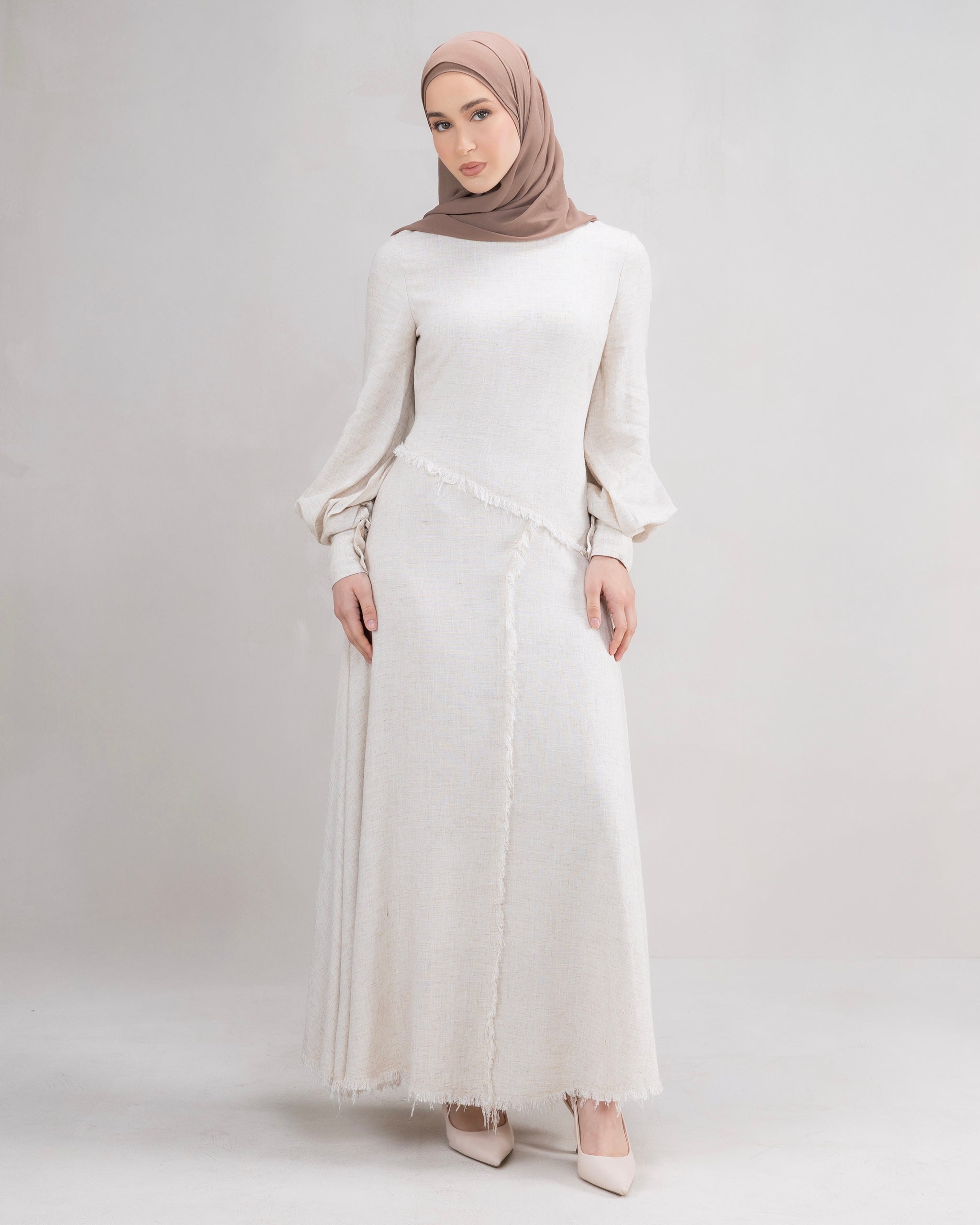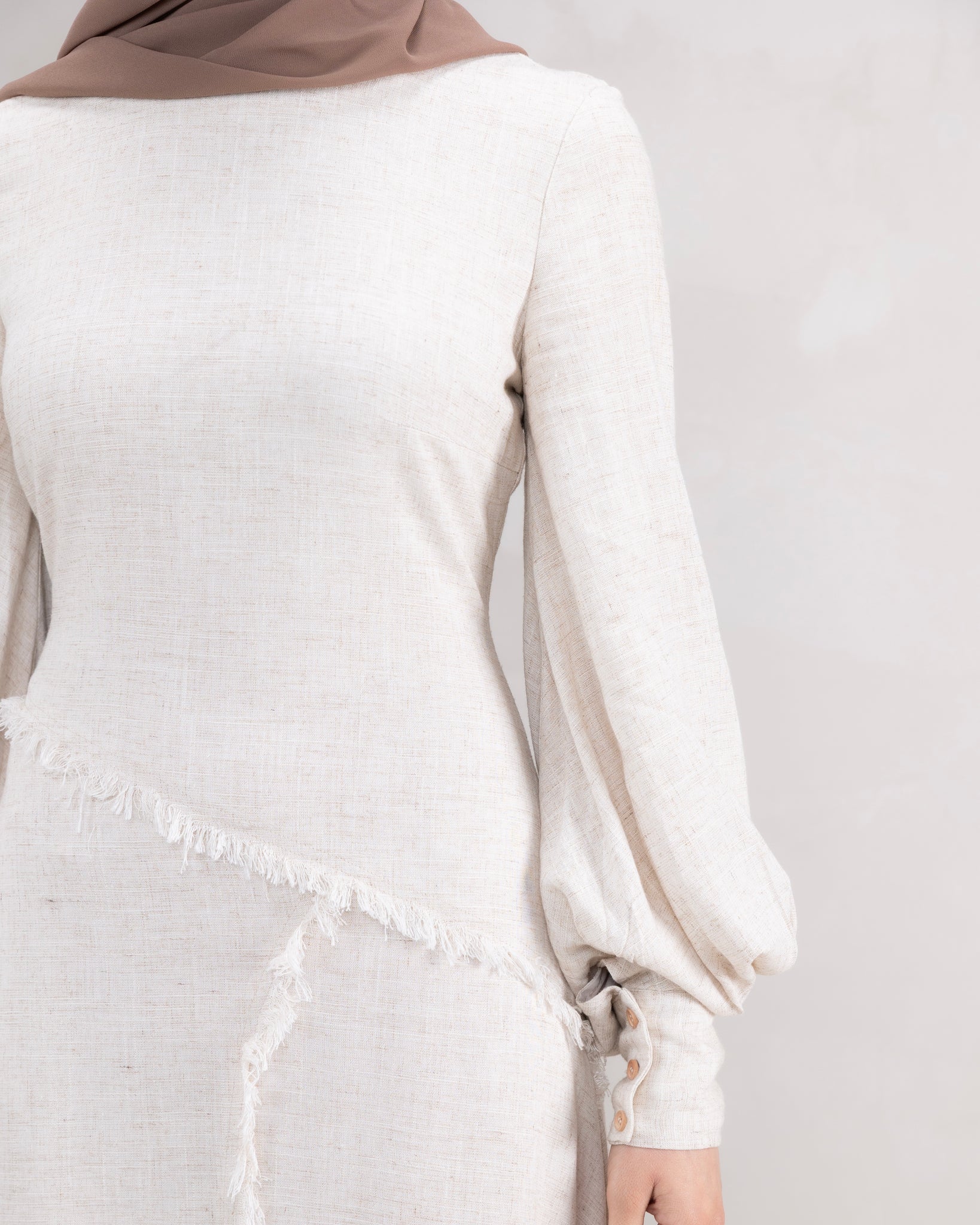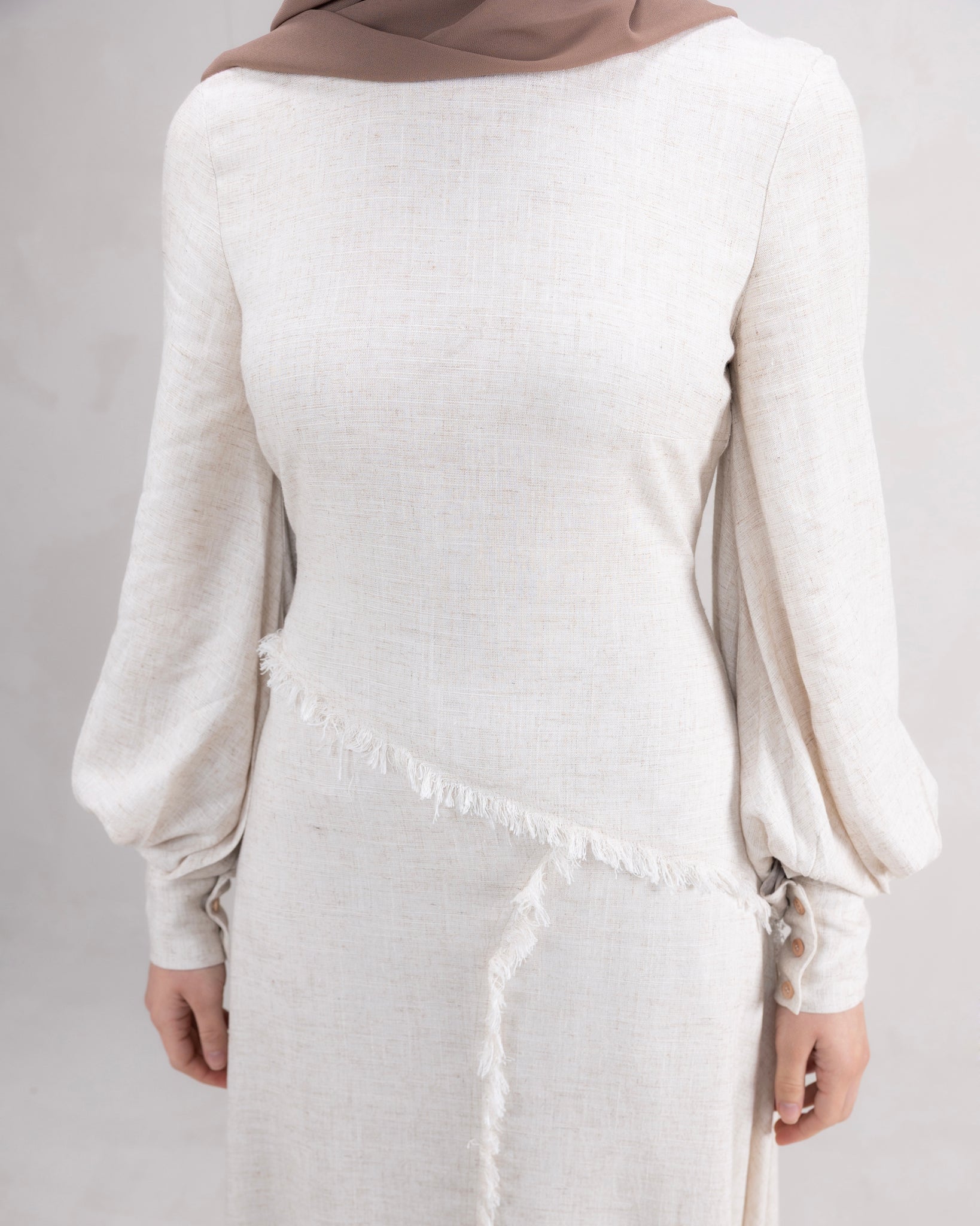 Introducing Lila, our dreamy asymmetrical linen dress. This dress features fringe details along the waistline and hem. For an earthy touch, Lila features wooden buttons along the cuffs. Perfect for your next vacation or upcoming event. Double lined.